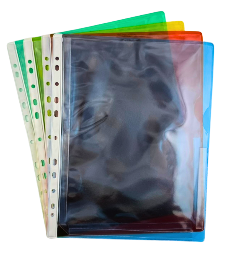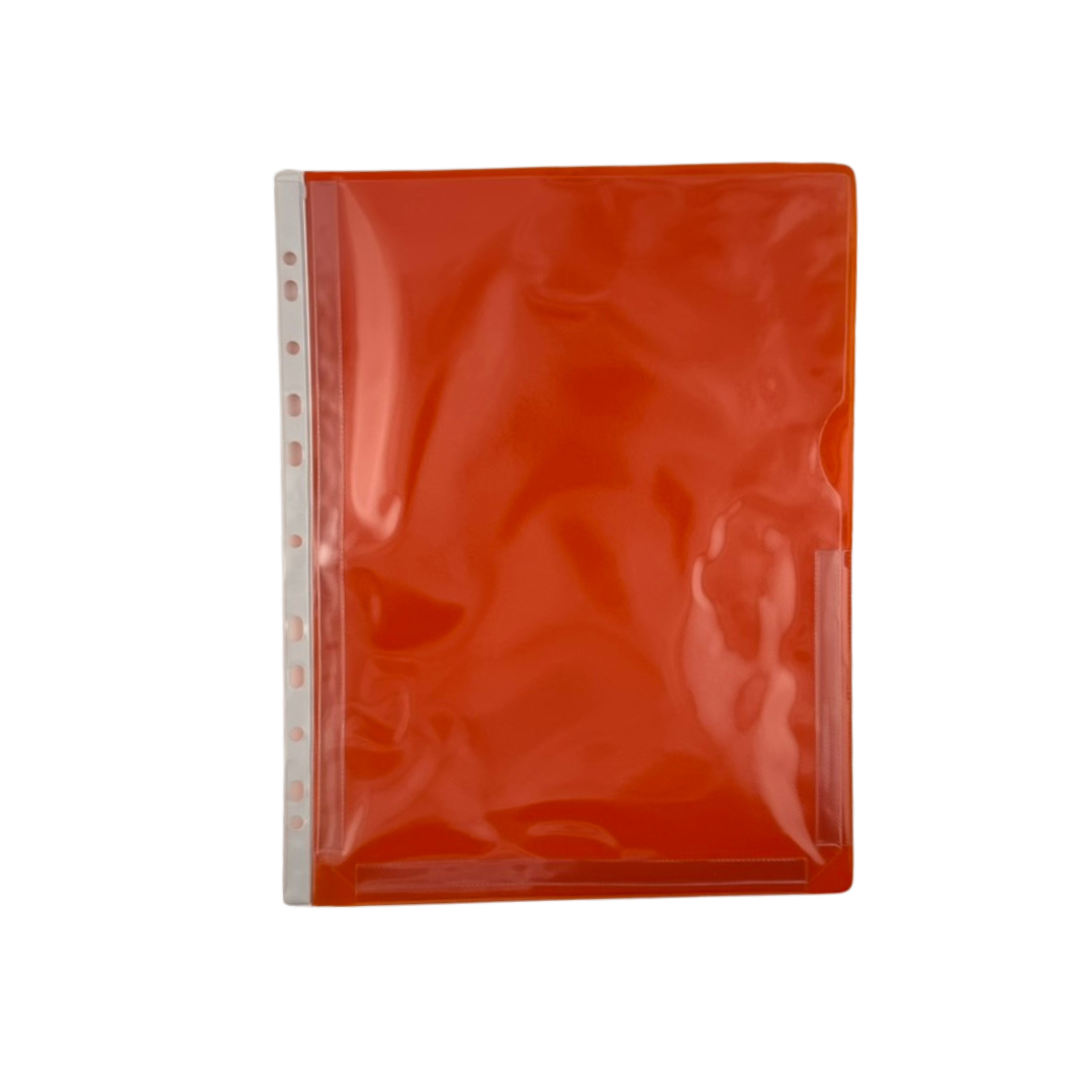 Plastficka med bälg som expanderar för att rymma en hel bunt A4-papper. Med hållist för att sättas i pärm. Finns i fyra färger med semitransparent baksida, Röd, Blå, Grön och Gul.