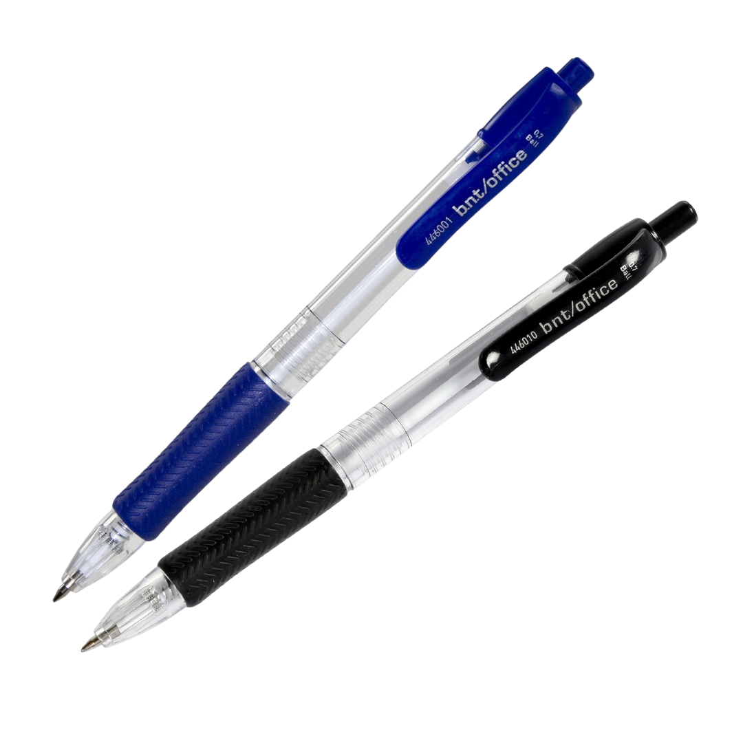 Kulspetspenna OFFICE, blå eller svart. med 0,7mm skrivbredd. Transparent kropp med färgade detaljer, clips och gummigrepp. 900 meters skrivlängd, certifierad enligt EN-71.