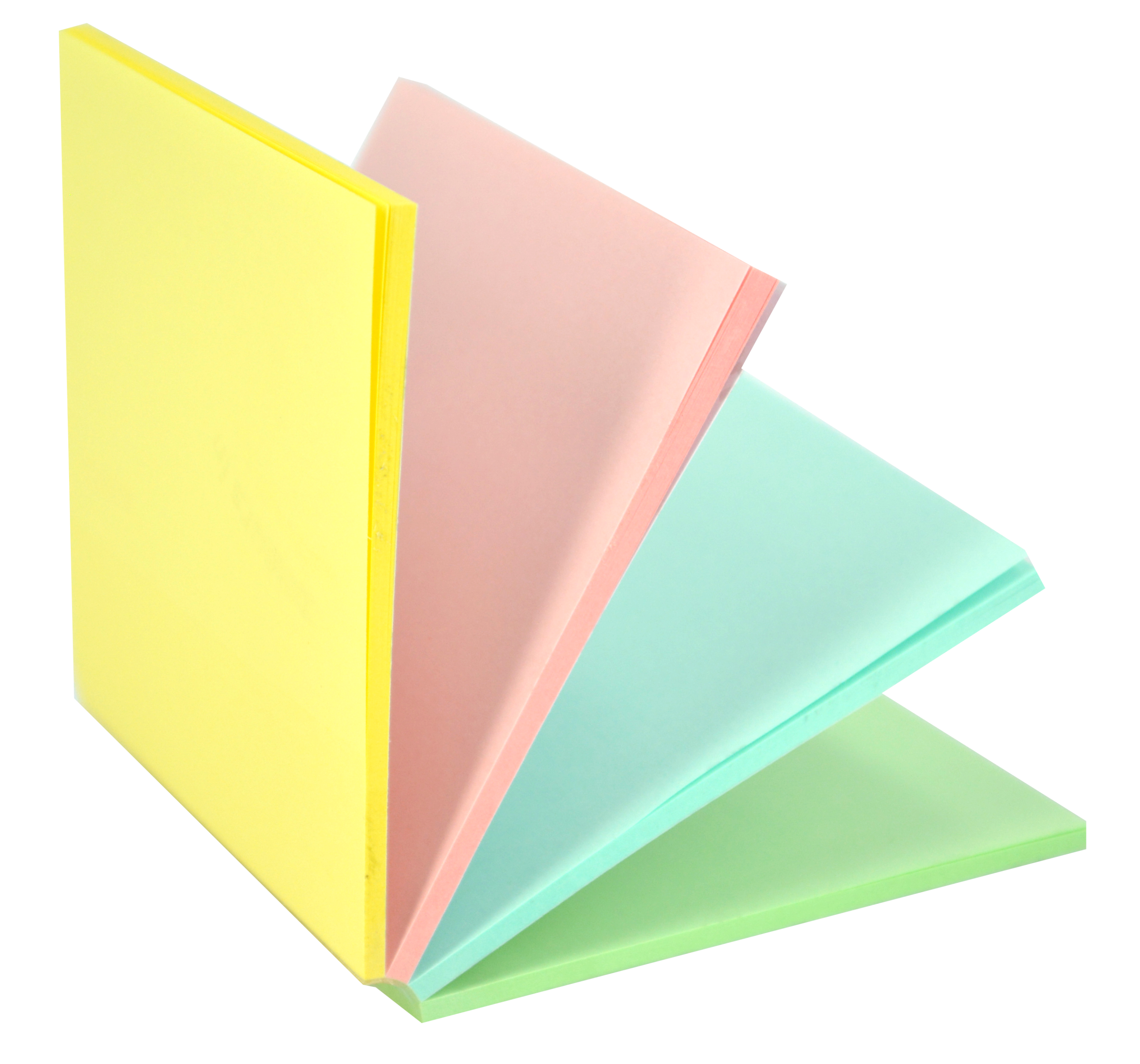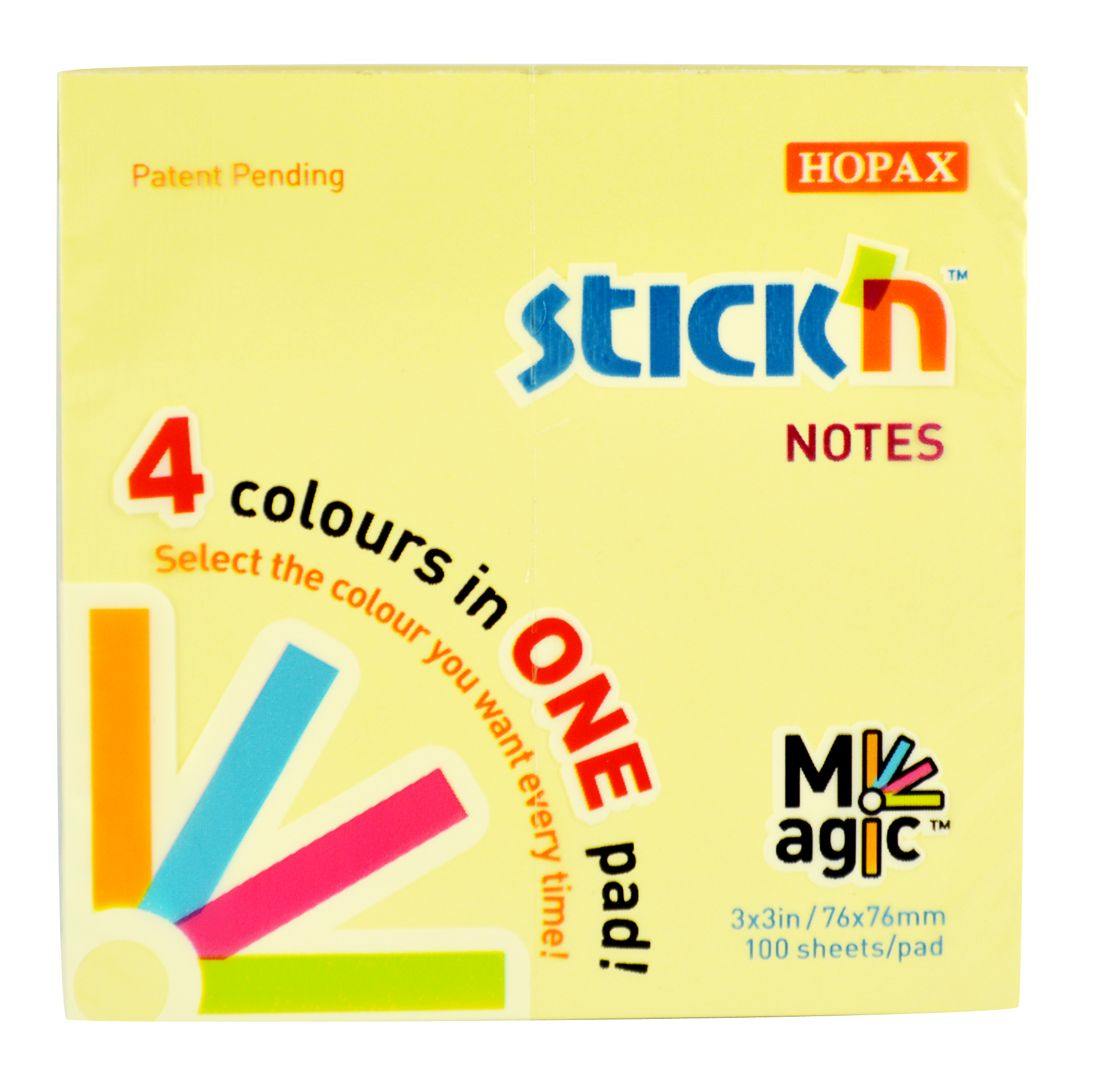 Självhäftande kom-ihåg-lappar i skiftande lager i 4 pastellfärger; gul, rosa, blå och grön. Magic serien innebär att du enkelt bläddrar fram till den färg du önskar utan att behöva ta det översta arket som på vanliga notisblock. 100 ark 76x76mm. 100 Blad Sorterade pastelfärger.