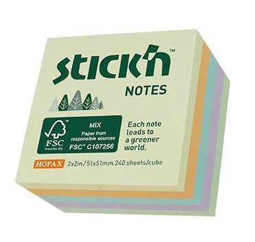 Paket med klisterlappar i 5 pastellfärger, storlek 51×51 mm. Tillverkad av miljövänliga ansvarsfulla källor. 100% vattenbaserat lim. 240 ark, pastellfärger: gul, orange, blå, lila, grön. Klistra på plast, kartong, glas, papper och många fler ytor. Lätt att fästa och ta bort utan att lämna några rester