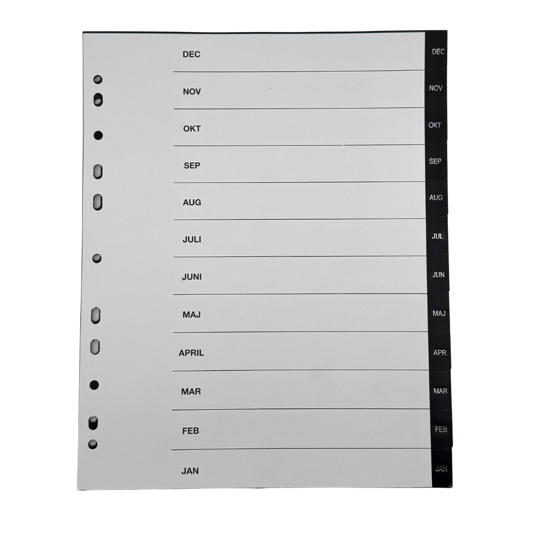 Register, omvänt från Dec-Jan. Försida i kraftigt papper och fliksidor i tålig pp-plast. Universalhålat för att passa alla pärmar för A4-format.